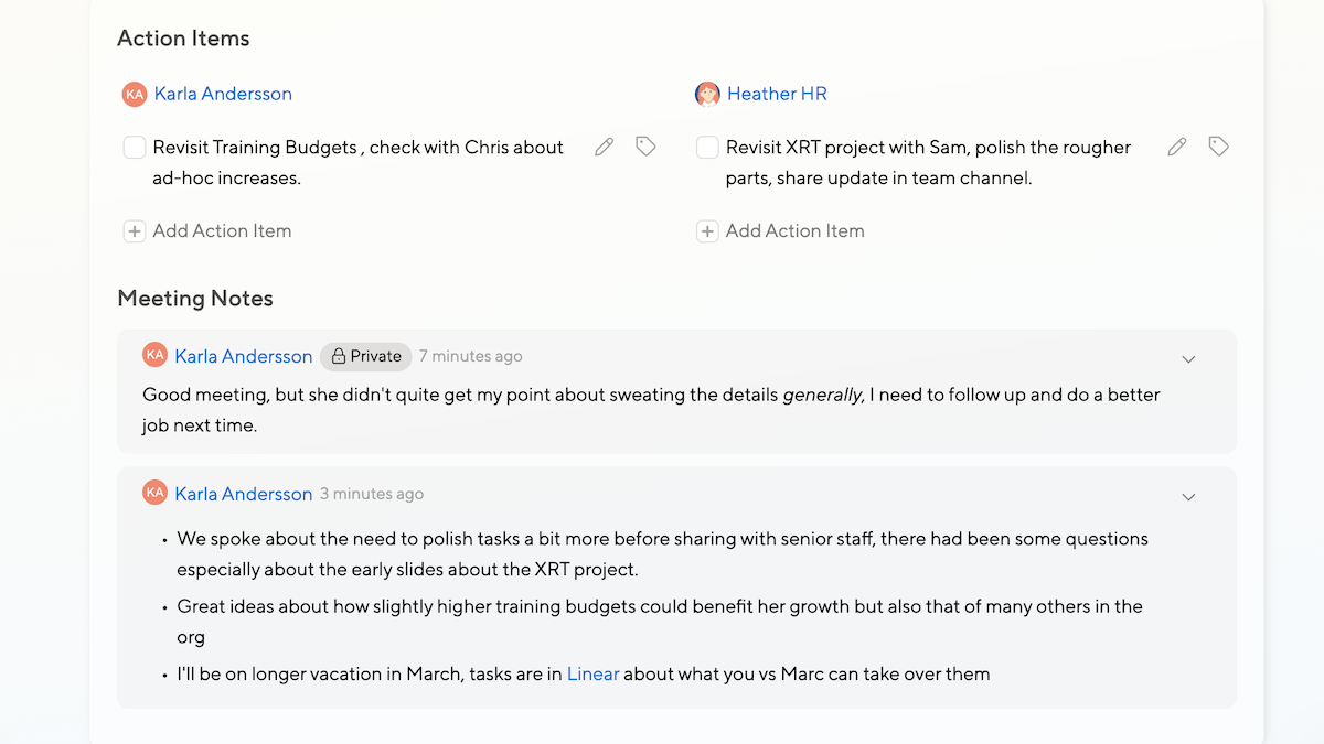 Reviews are not the end, but the beginning: Turn Reviews into Action by defining new Objectives, with some AI help if you like. Agree on Key Results for improvement or for personal career growth. Check in regularly, comment on progress, share updates, and achieve goals.