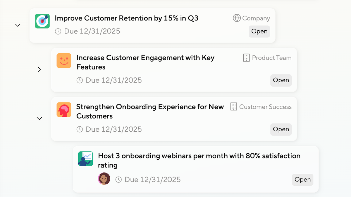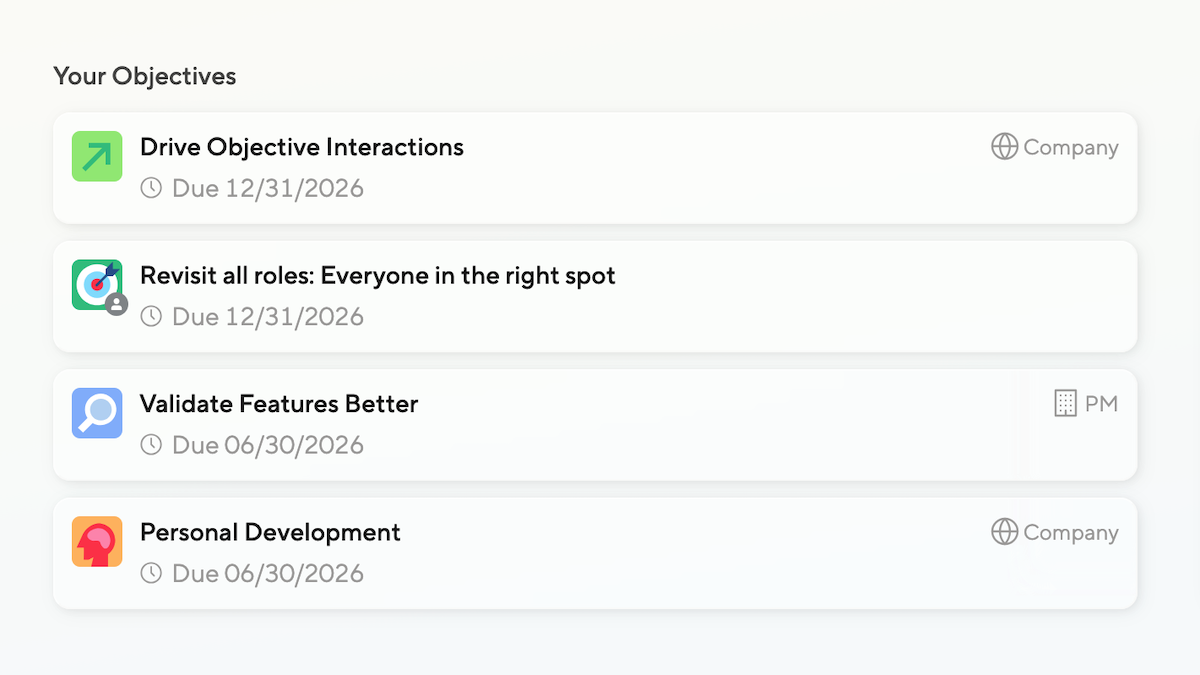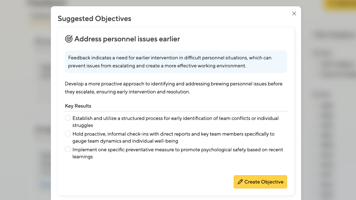 Reviews are not the end, but the beginning: Turn Reviews into Action by defining new Objectives, with some AI help if you like. Agree on Key Results for improvement or for personal career growth. Check in regularly, comment on progress, share updates, and achieve goals.