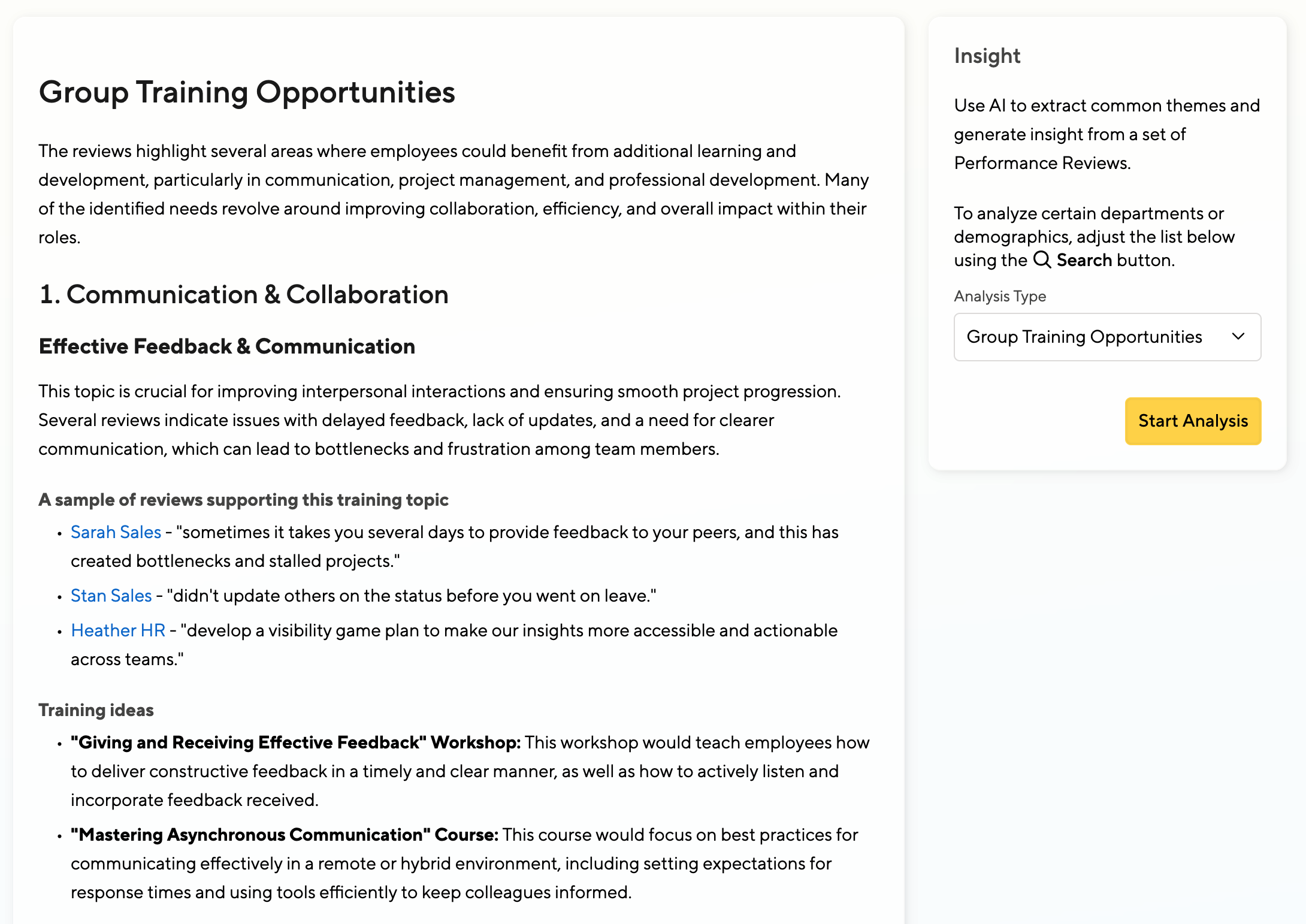 Launch a review cycle in minutes, and automate notifications at every step along the way. Analytics help you identify trends, AI-powered insight uncovers challenges and training needs.