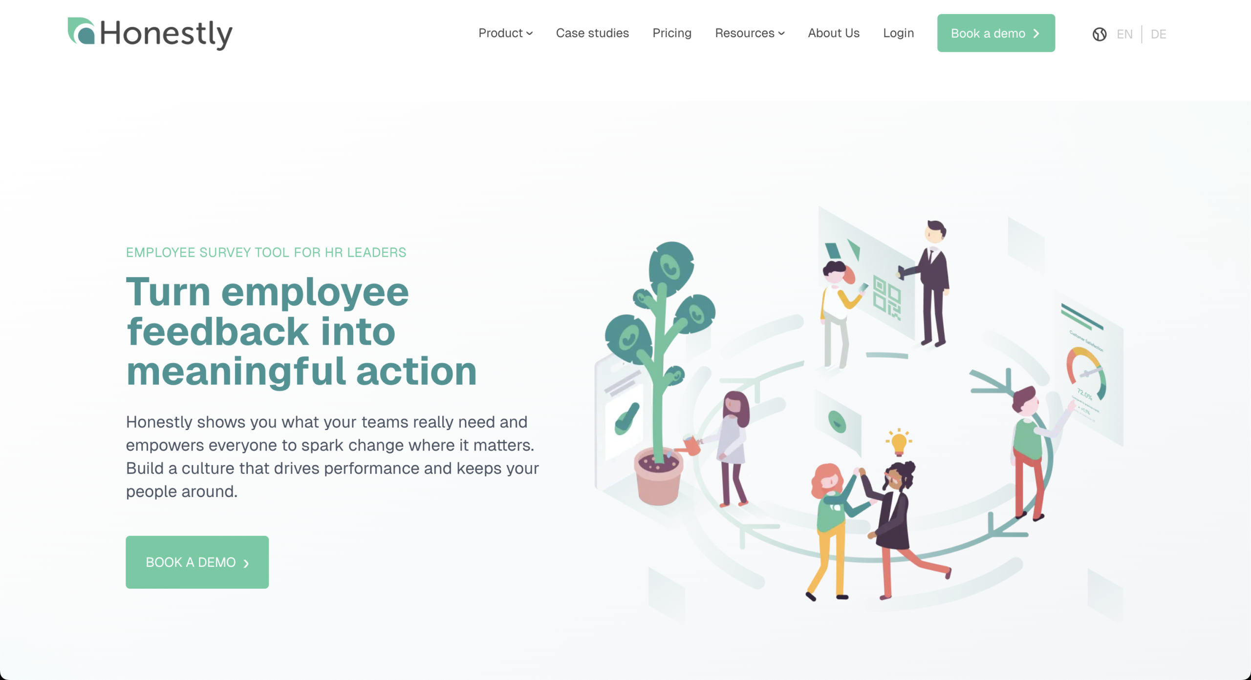 Honestly combines academic rigor with practical deployment. Built in partnership with FU Berlin, the platform delivers pulse and engagement surveys, 360° feedback, onboarding, exits, and custom surveys. AI text analysis categorizes feedback automatically. Impact Prediction identifies which drivers move engagement most. Anonymous chat enables sensitive discussions within anonymity thresholds.