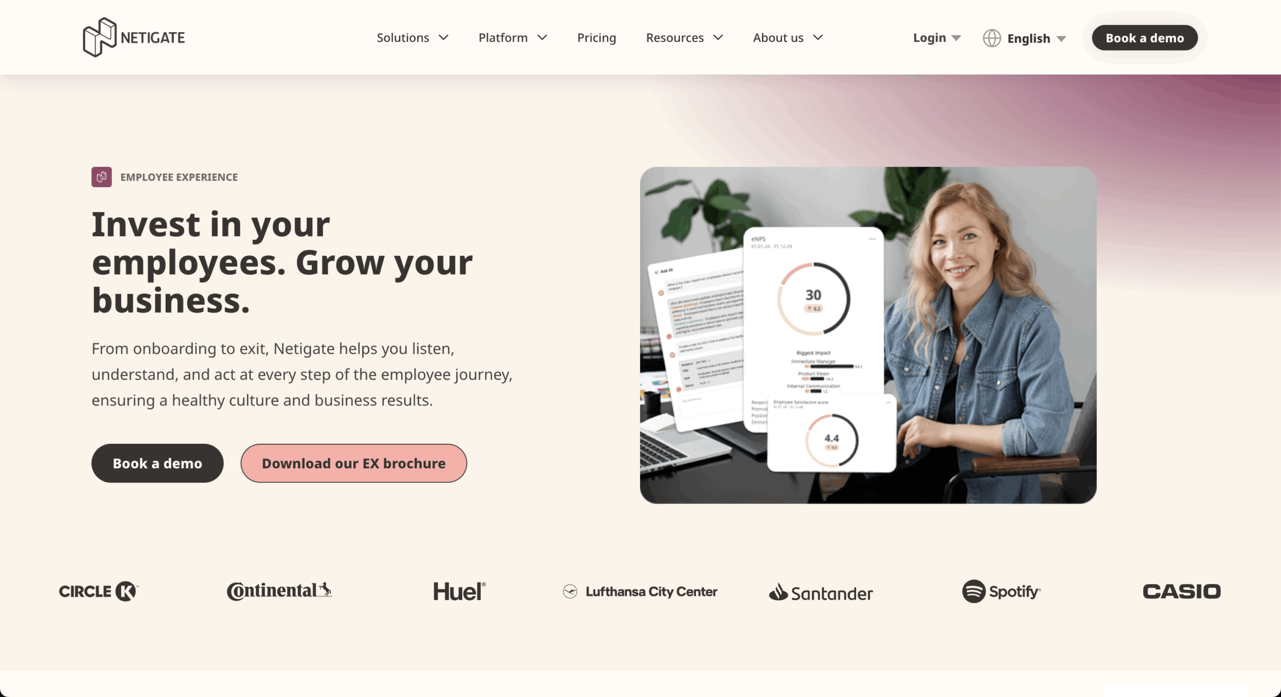 Netigate offers advanced reporting, AI text analysis, and customisable survey templates for both employee and customer feedback. It’s ideal for organisations that take data seriously and want one platform for all feedback types.