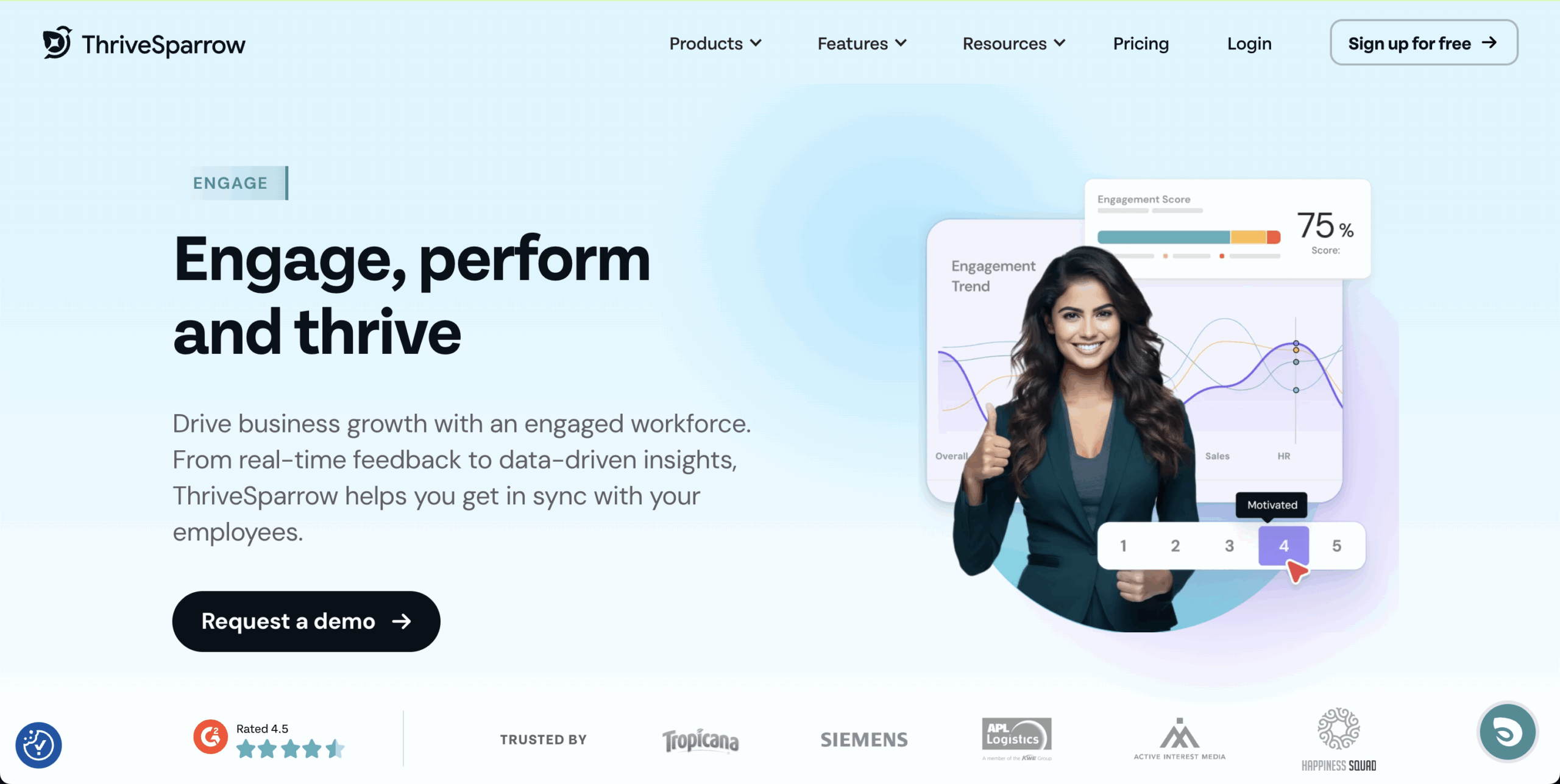 ThriveSparrow lets HR teams run pulse surveys, measure sentiment, and track improvement actions in one dashboard. Its AI engine categorises responses and heat maps make engagement trends visible at a glance.