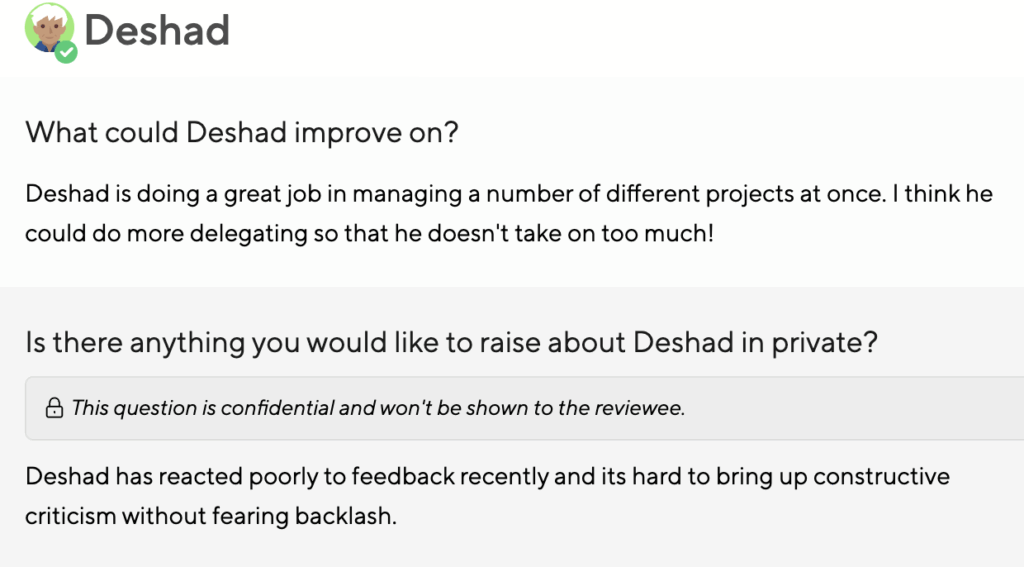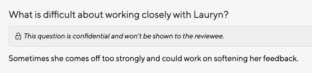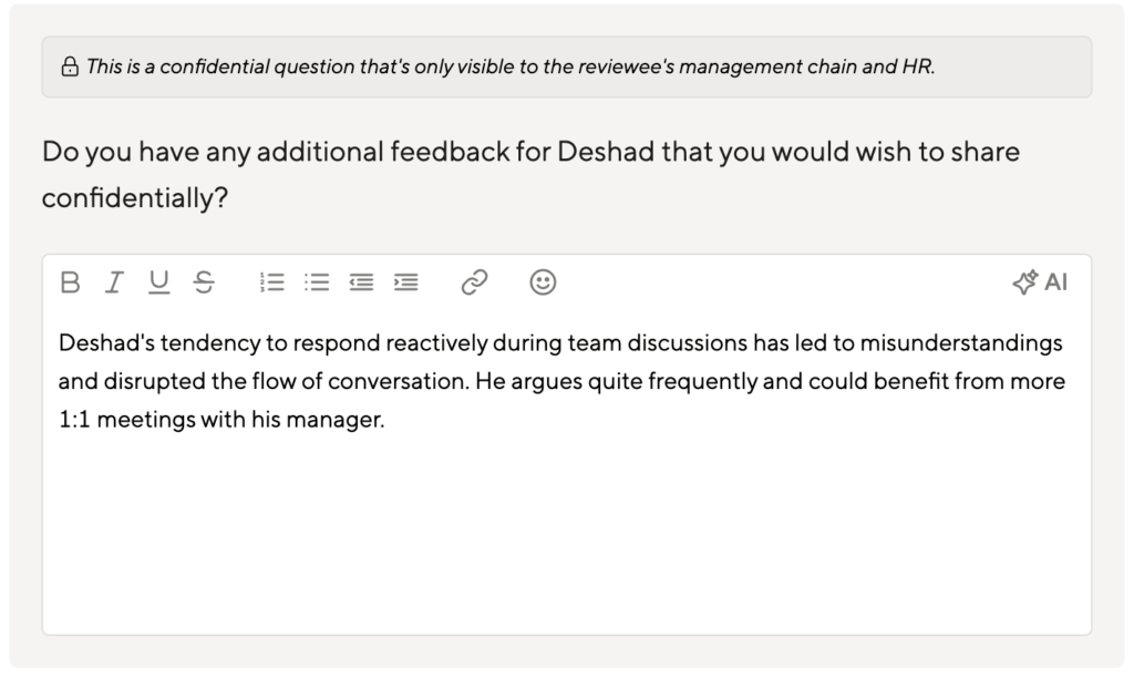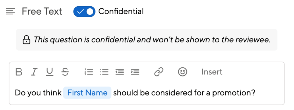 With Confidential Questions that are only visible to the manager, you create space for authentic, psychologically safe feedback without sacrificing transparency where it matters.