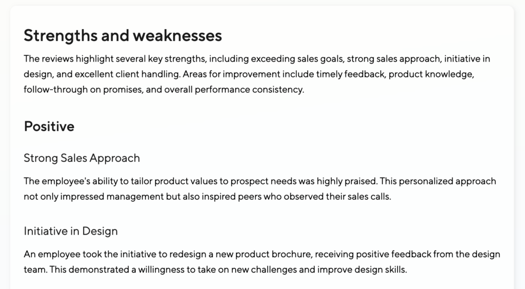 Sometimes it can be more helpful to get a summary of the entire cycle, or of (for instance) a department or location. Just filter down to whose reviews you want an overview on, select “Cycle Insights”, and you’ll receive an overview of the main topics, both positive and constructive.