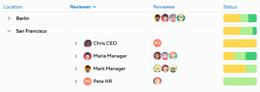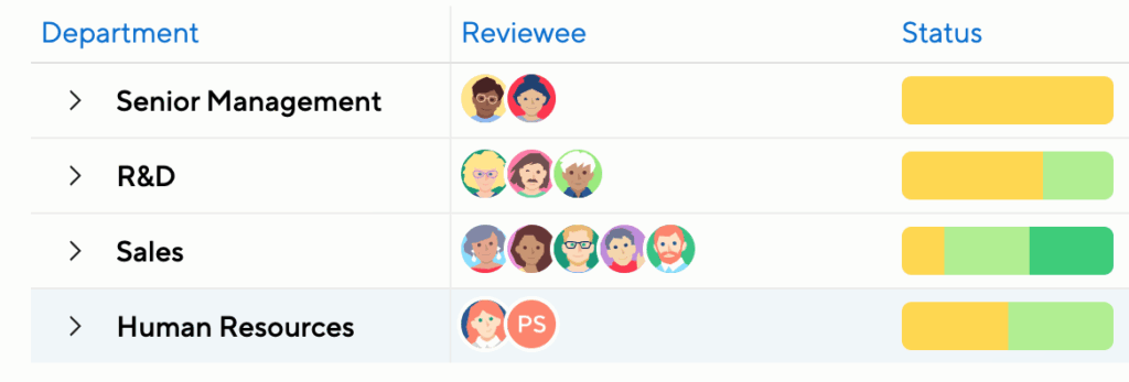 Rather than just filter or sort by review status, you can now get an overview of where entire departments or locations stand. Select “Group by” and pick “By department,” for example.