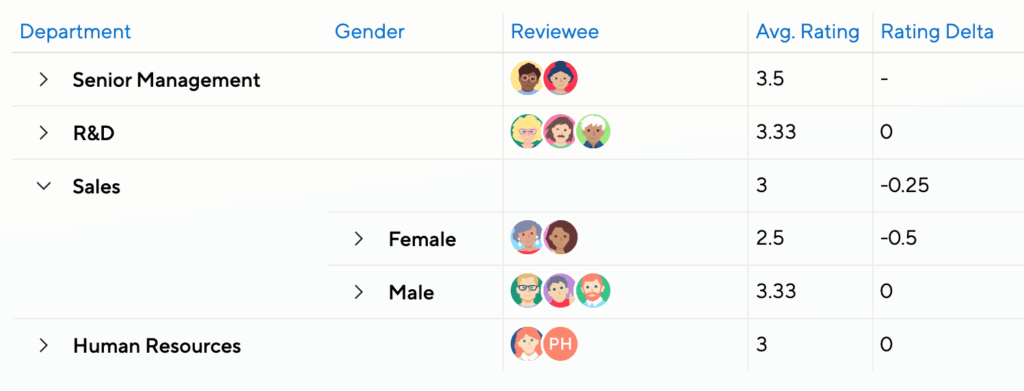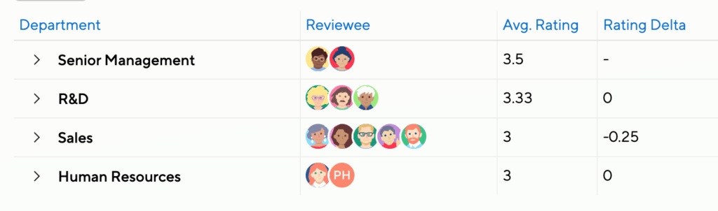 When grouping by department, for example, you can immediately see the average manager rating and the average self-assessment in this department. Rating deltas are also a powerful way to track alignment.