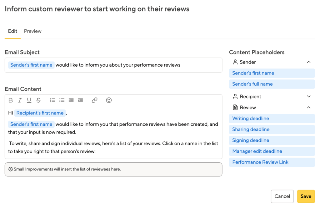 Almost everything in the review system can be adjusted by HR, from your questions to the email reminders, from the color palette to the actual feature name: “Appraisal”? “Review”? “Check-in”?